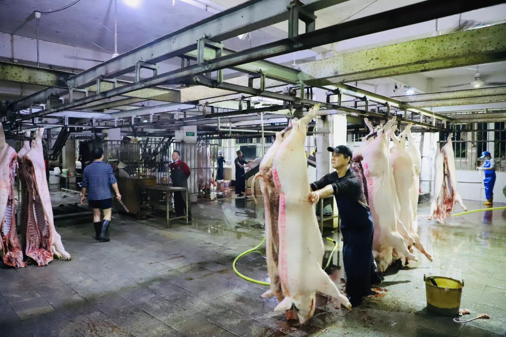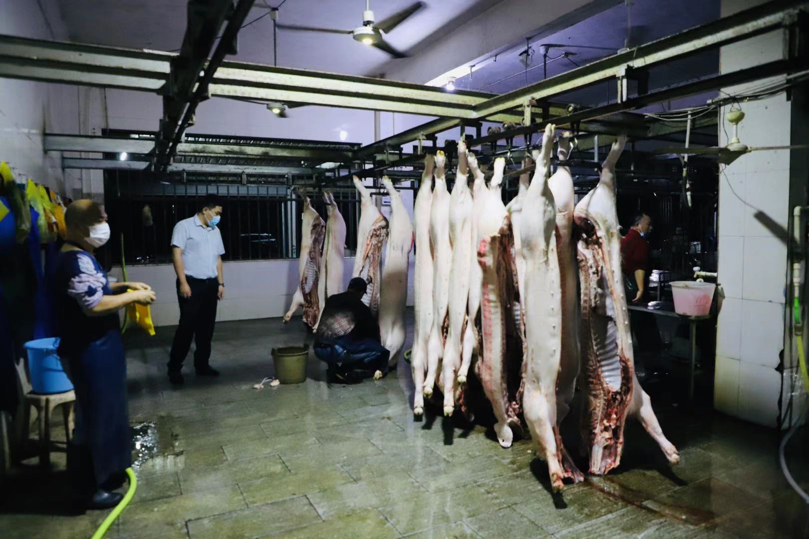 “戴好手套口罩,穿好膠鞋,進場前做好消毒沖水!豬肉分拆處理干凈就趕緊裝車,后面兄弟單位還在排隊,快快快!”凌晨兩點多,茂名濱海發(fā)展集團下屬子公司爵山食品公司燈火通明,屠宰工、清洗工數(shù)十余人已在緊張有序地開展生豬屠宰一線生產(chǎn)工作。