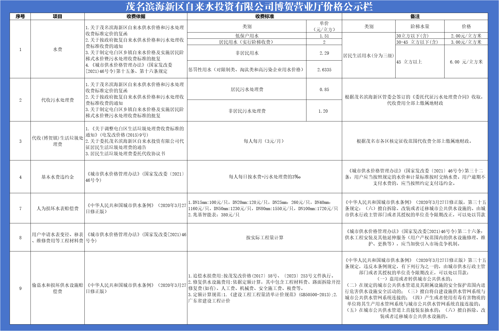 水是生命之源,更是保障日常生活與生產經營的重要基礎。為切實保障每一位用戶的合法權益,進一步規范自來水收費服務流程,提升收費透明度,讓大家明明白白消費,茂名濱海新區自來水投資有限公司現將旗下電城鎮營業廳、博賀鎮營業廳的自來水收費標準、計費方式等核心信息進行集中公示。